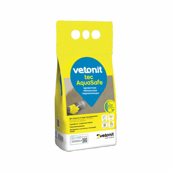 Vetonit tec AquaSafe — цементная жесткая обмазочная гидроизоляция для защиты строительных конструкций от воды, в том числе под давлением, для гидроизоляции фундаментов, стен подвалов, гидротехнических сооружений (в том числе с питьевой водой), террас, балконов, ступеней, бассейнов, стен и полов (внутри и снаружи) под последующую облицовку плиткой, в мокрых и влажных помещениях (например, ванные комнаты, кухни, сан.узлы, прачечные и др.).