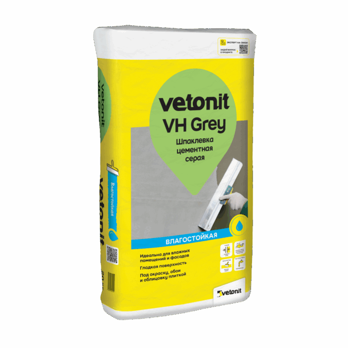 Vetonit VH grey — цементная серая шпаклевка, подходит для финишного выравнивания стен и потолков перед оклейкой обоями или покраской. Предназначена для влажных помещений и для наружного применения. Имеет серый цвет, является влагостойкой и высокопрочной. Качество поверхности после шлифовки не ниже К2 согласно СП 71.1330 2017.